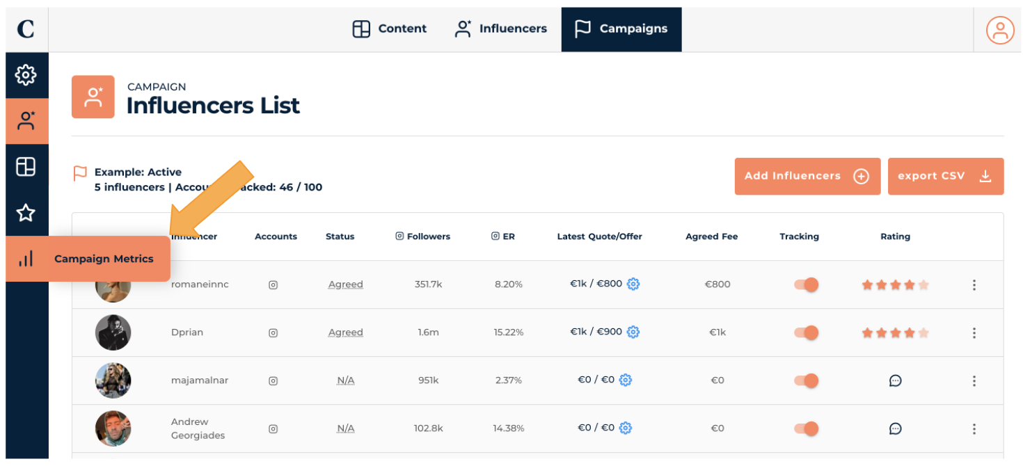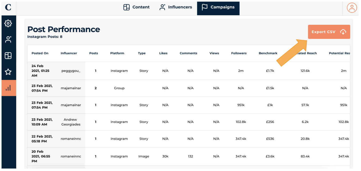 2. Influencer Performance – you can download this as a CSV; this lists all the influencers who have posted content in the campaign and allows you to sort by the columns so you can easily discover the best performing influencer, etc.